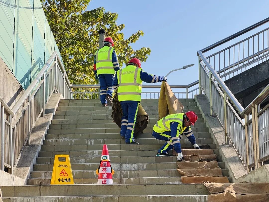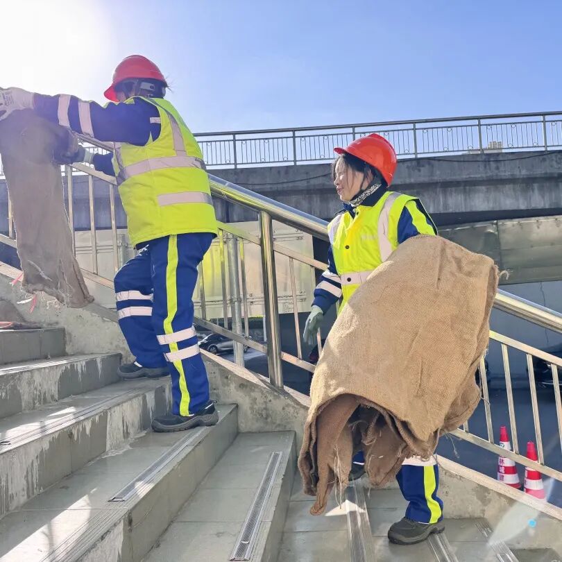 “雪未落地,防护先行”——这一环节重点检验了“预判-响应-处置”的快速反应机制,仅15分钟便完成整座桥人行台阶的防滑覆盖,为后续降雪天行人安全“上保险”。